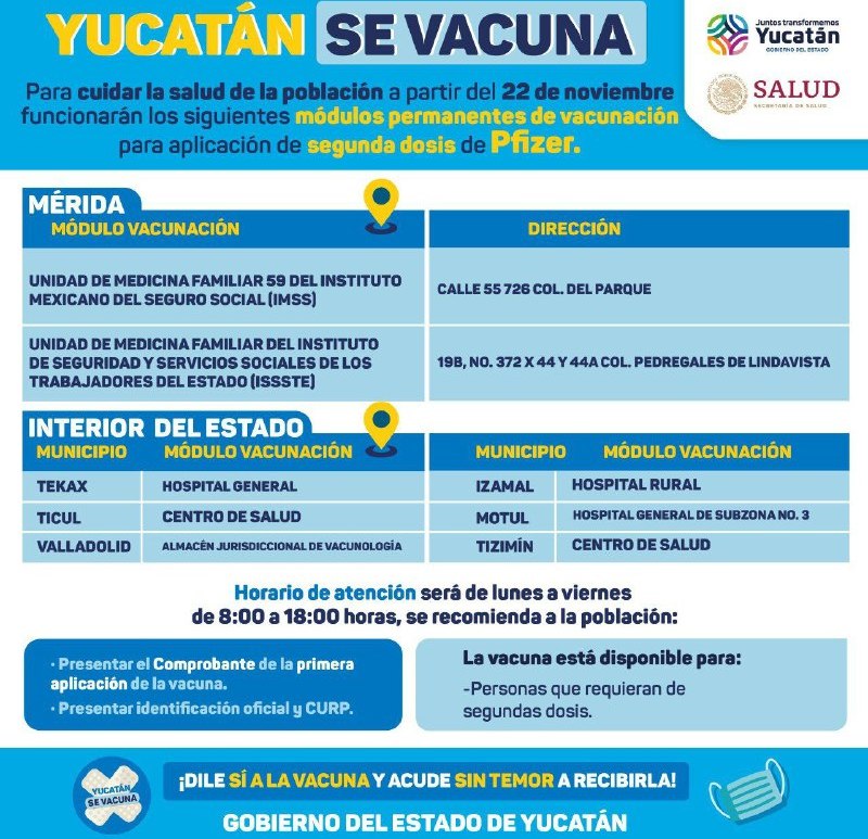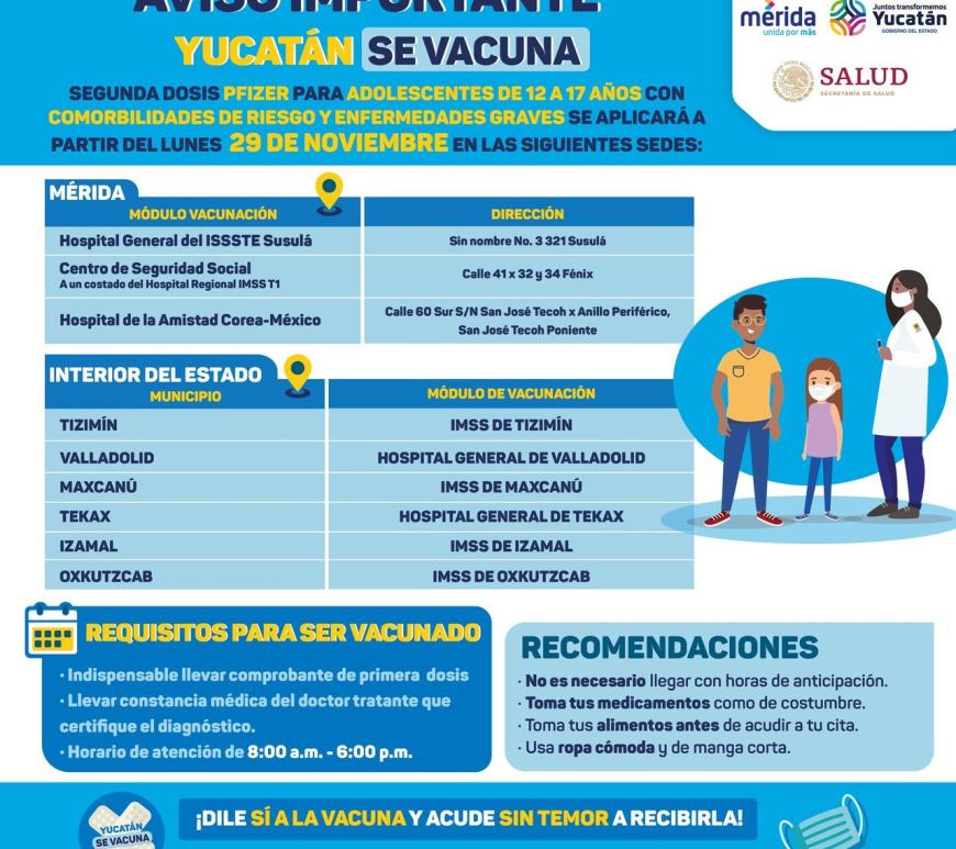 -El proceso de vacunación se llevará a cabo en hospitales de los municipios de Mérida, Tizimín, Valladolid, Maxcanú, Tekax, Izamal y Oxkutzcab. -Es indispensable que el adolescente que vaya a recibir la segunda vacuna presente su comprobante de vacunación de la primera dosis. Mérida, Yucatán, 21 de noviembre de 2021.- Adolescentes de 12 a 17 años de edad con comorbilidades de riesgo y enfermedades graves … Continúa leyendo Adolescentes de 12 a 17 años de edad con comorbilidades de riesgo y enfermedades graves recibirán segunda dosis contra el Coronavirus a partir del próximo 29 de noviembre