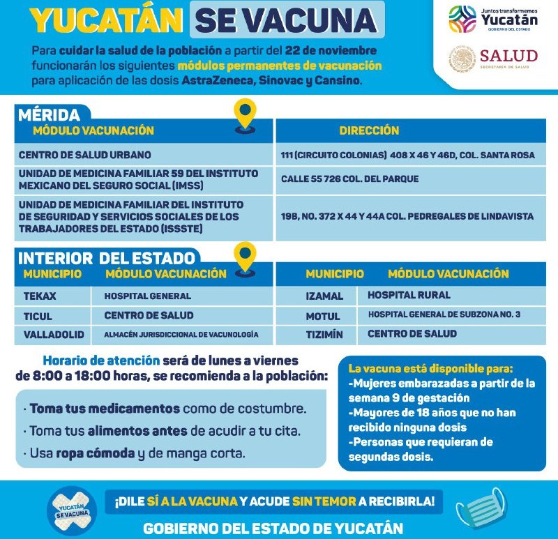 Mérida, Yucatán, 18 de noviembre de 2021.- Con el cambio a verde en el color del semáforo epidemiológico estatal tras el marcado descenso en los indicadores que miden el comportamiento de la pandemia del Coronavirus y el significativo avance en la vacunación, la Secretaría de Salud de Yucatán (SSY) anunció que a partir del próximo lunes 22 de noviembre se autoriza la operación hasta las … Continúa leyendo La Secretaría de Salud de Yucatán anunció que a partir del próximo lunes 22 de noviembre se autoriza la operación hasta las 2 de la mañana con aforo del 75% de actividades económicas de cualquier tipo