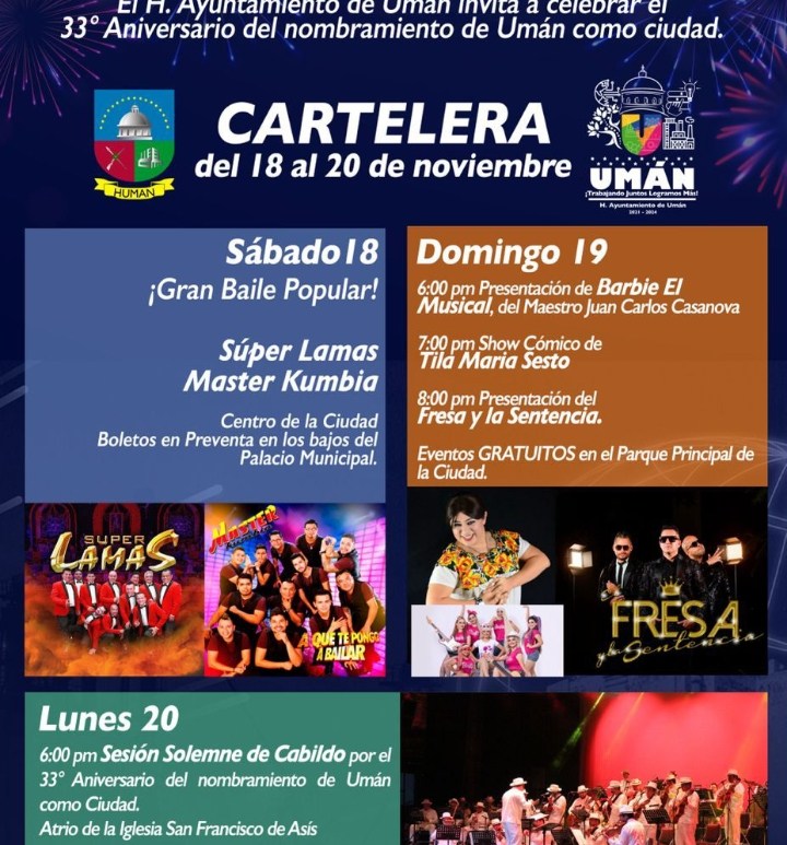 – Un día como hoy, 20 de noviembre hace 33 años en 1990, la villa de Umán fue nombrada Ciudad. Umán, Yucatán a 20 de Noviembre de 2023.- Hace 33 años, en un día como hoy donde celebramos un aniversario más de las Revolución Mexicana, la Villa de Umán fue nombrada Ciudad, y desde entonces muchos cambios ha tenido. Siendo presidente municipal el Señor Carlos … Continúa leyendo Celebra Umán sus 33 años de ser nombrada Ciudad